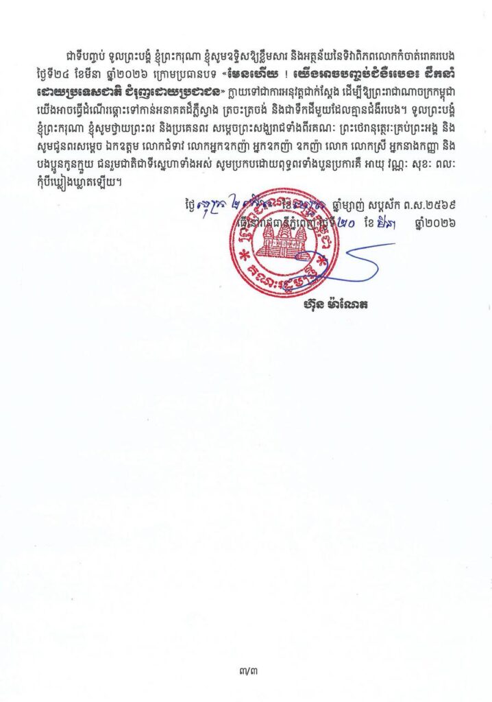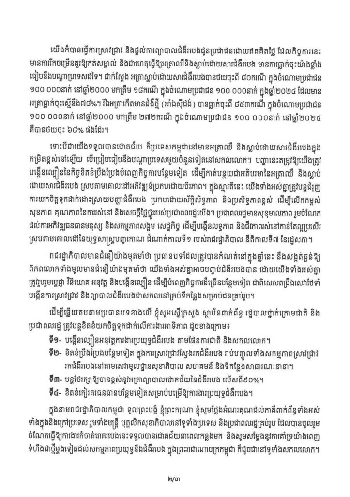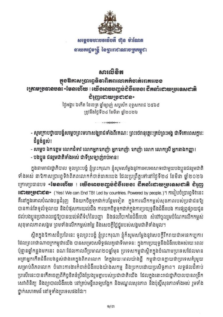 (ភ្នំពេញ)៖ សម្តេចបវរធិបតី ហ៊ុន ម៉ាណែត នាយករដ្ឋមន្ត្រីនៃកម្ពុជា បានចេញសារលិខិត ក្នុងឱកាសប្រារព្ធទិវាពិភពលោកកំចាត់រោគរបេង ក្រោមប្រធានបទ៖ «មែនហើយ ! យើងអាចបញ្ចប់ជំងឺរបេង៖ ដឹកនាំដោយប្រទេសជាតិ ជំរុញដោយប្រជាជន»។